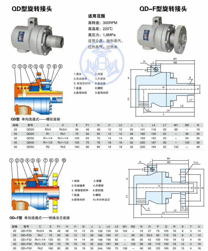 QD-F型蒸汽旋转接头适用参数:适用转速:100RPM适用温度:220℃适用压力:1.8MPa适用介质:饱和蒸汽、过热蒸汽、过热水产品材质:球墨铸铁使用环境: 熟料压延机、密炼机、液压设备、涂层机械等使用蒸汽或热水的设备