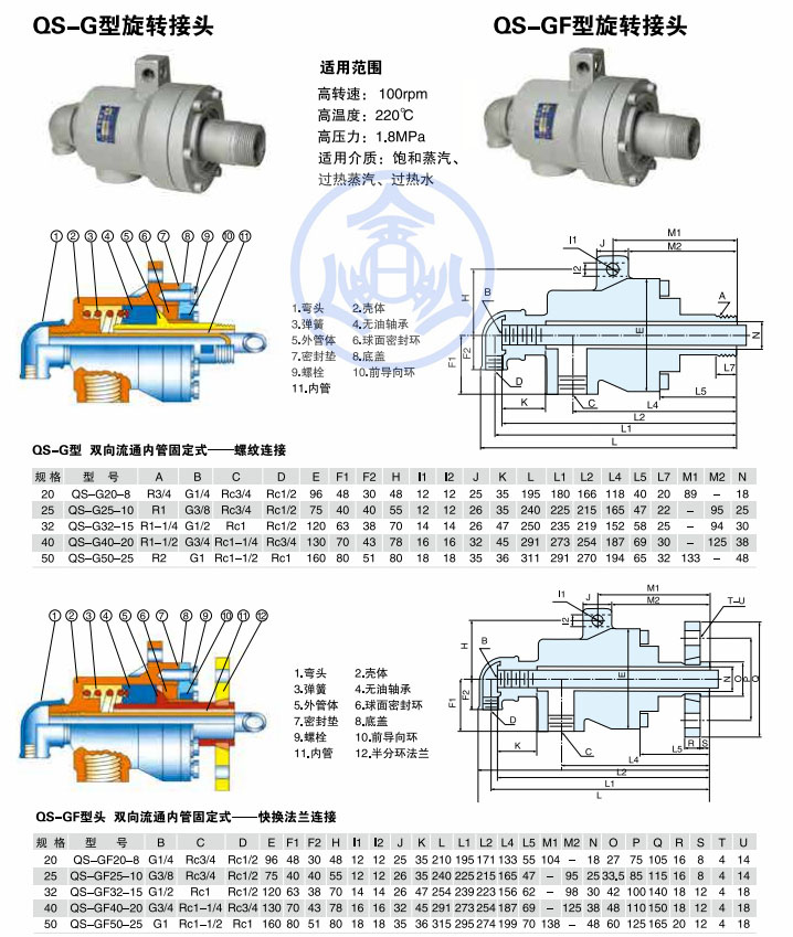 QS-GF型蒸汽旋转接头适用参数:适用转速:≤100RPM适用温度:220℃适用压力:1.8MPa适用介质:饱和蒸汽、过热蒸汽、过热水产品材质:球墨铸铁使用环境: 熟料压延机、密炼机、液压设备、涂层机械等使用蒸汽或热水的设备