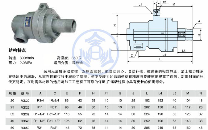 XHQRSS高温导热油旋转接头型号是普通高温导热油型的改进型号,有耐高温,密封可靠,无需润滑,密封结构简单等特点,密封结构内部采用是球面密封,双球座密封是改进型的新特点,外部设有紧固填充密封,可以有效解决轻微的漏油情况。广泛应用于一些同轴度不高,转速较低的设备,本产品可以自动补偿、自动调心。同时本产品维护简单,无需特别保养,是高温导热油型的新型产品。